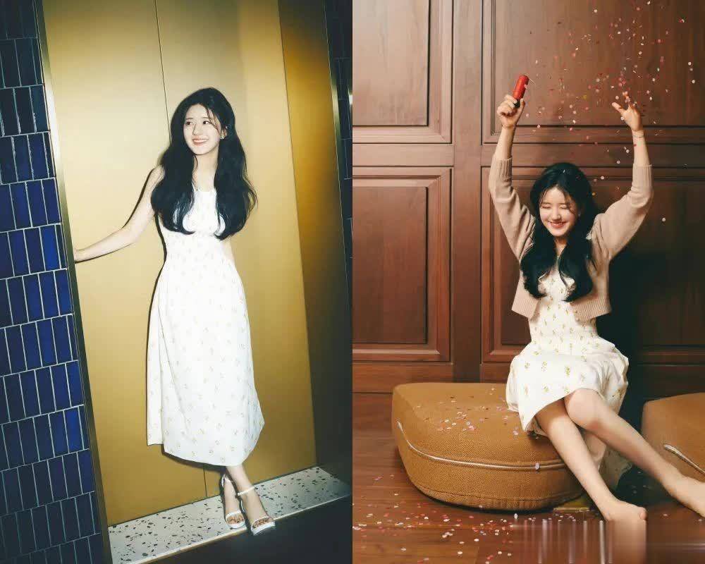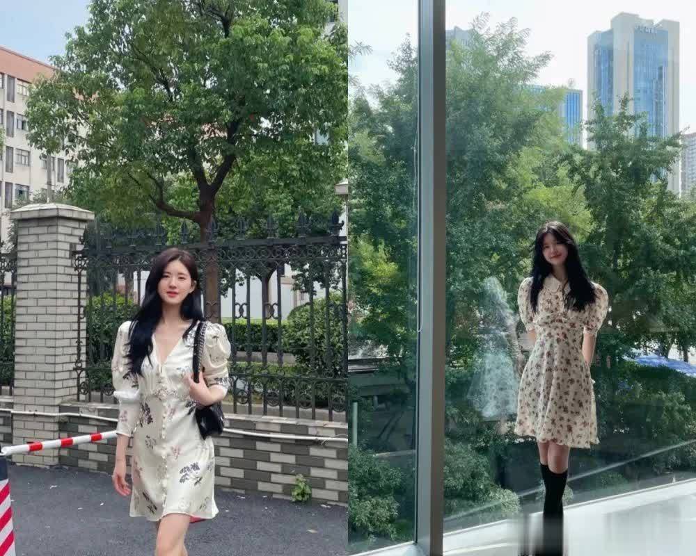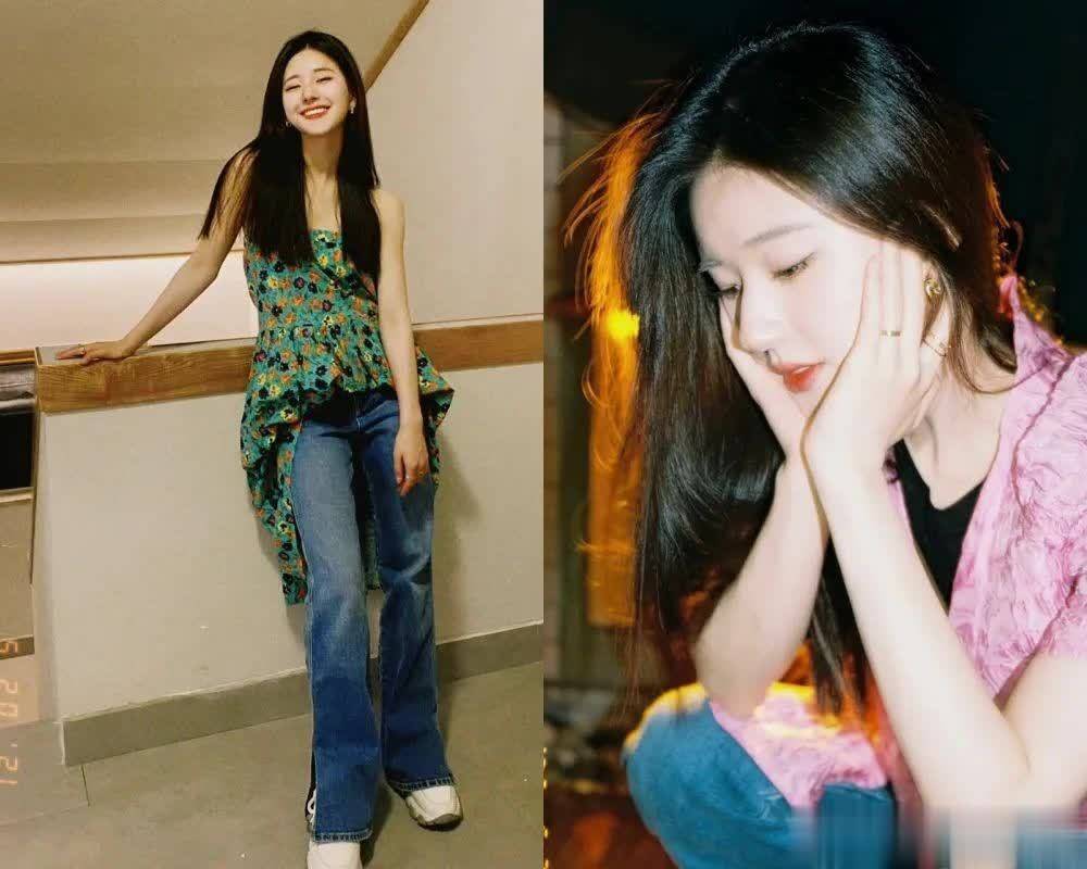 去年在韩国流行的碎花裙加牛仔裤搭配,她也试过,但与单穿相比稍显逊色。下面这两身穿起来不能说不好看,只是不太适合她的长相和气质,单穿或许会更好看。