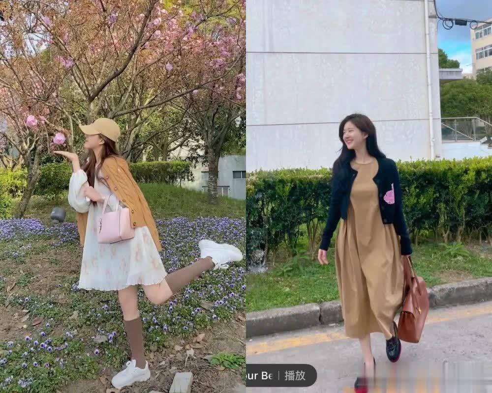她喜欢在裙子外面披一件开衫,既能保暖又能提升开衫利用率,是这个季节超合适的穿搭。