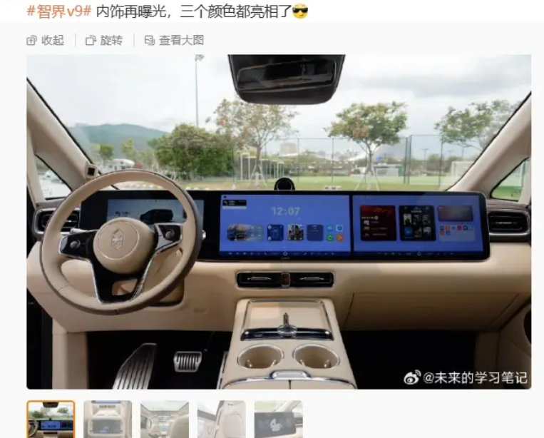 画面显示,智界V9主驾配备圆形三幅式方向盘,搭载流媒体后视镜,沿用家族化怀挡结构设计。首发一体"环宇"三联屏,双17.2英寸大屏,21:10宽屏比,双3.4K画质,HDR Vivid菁彩影像认证,搭载自由卡片桌面。最前方配有鸿蒙智行家族式星环散射体。