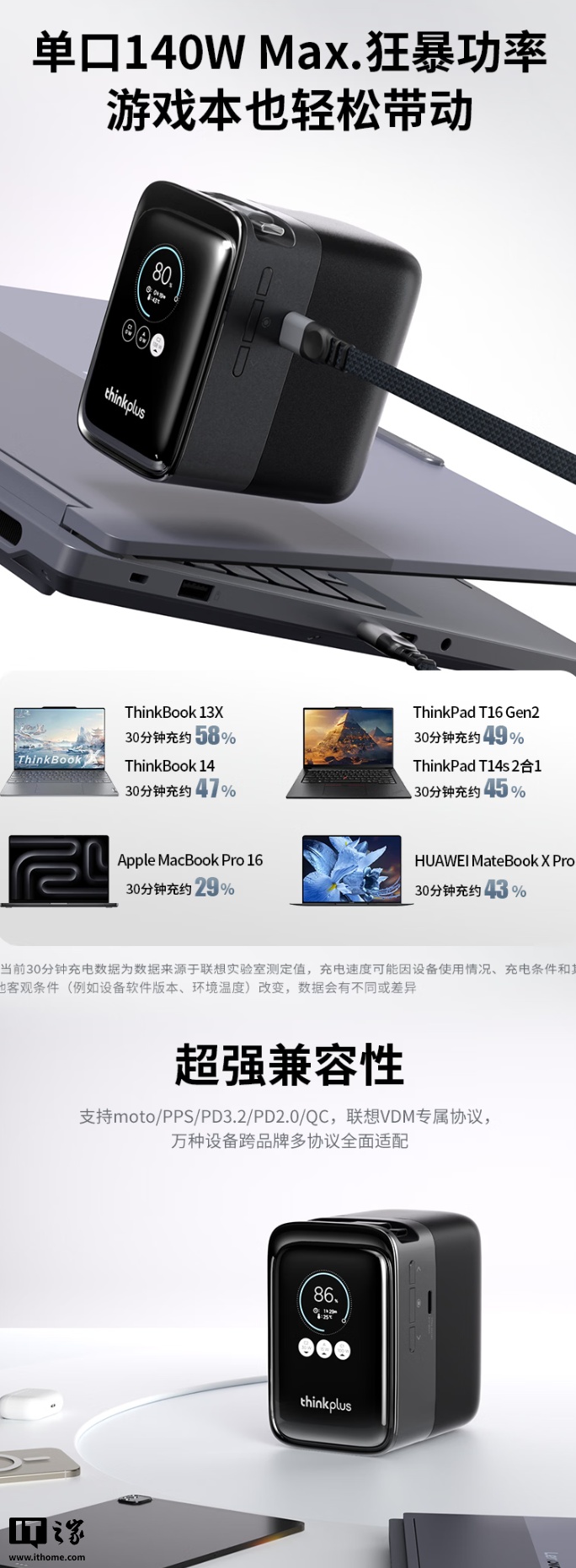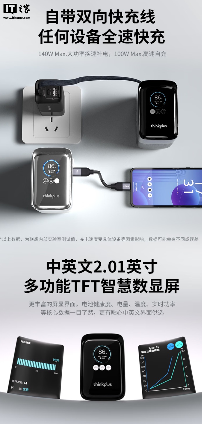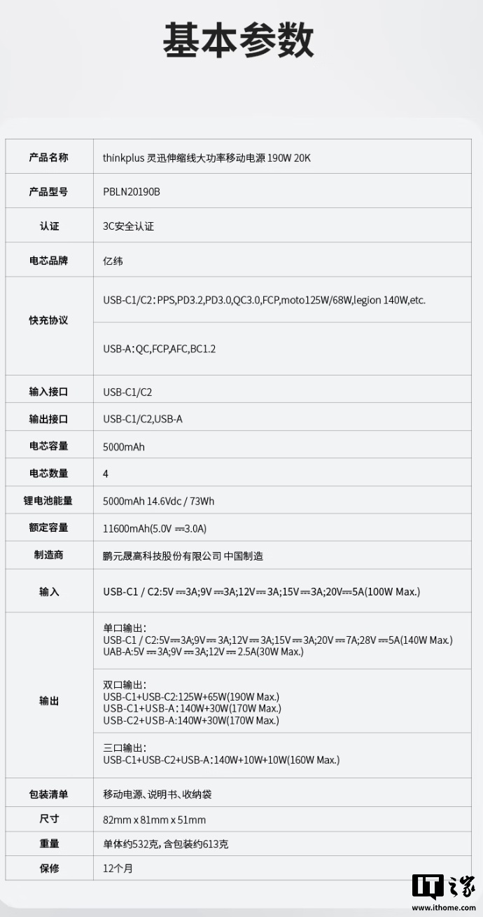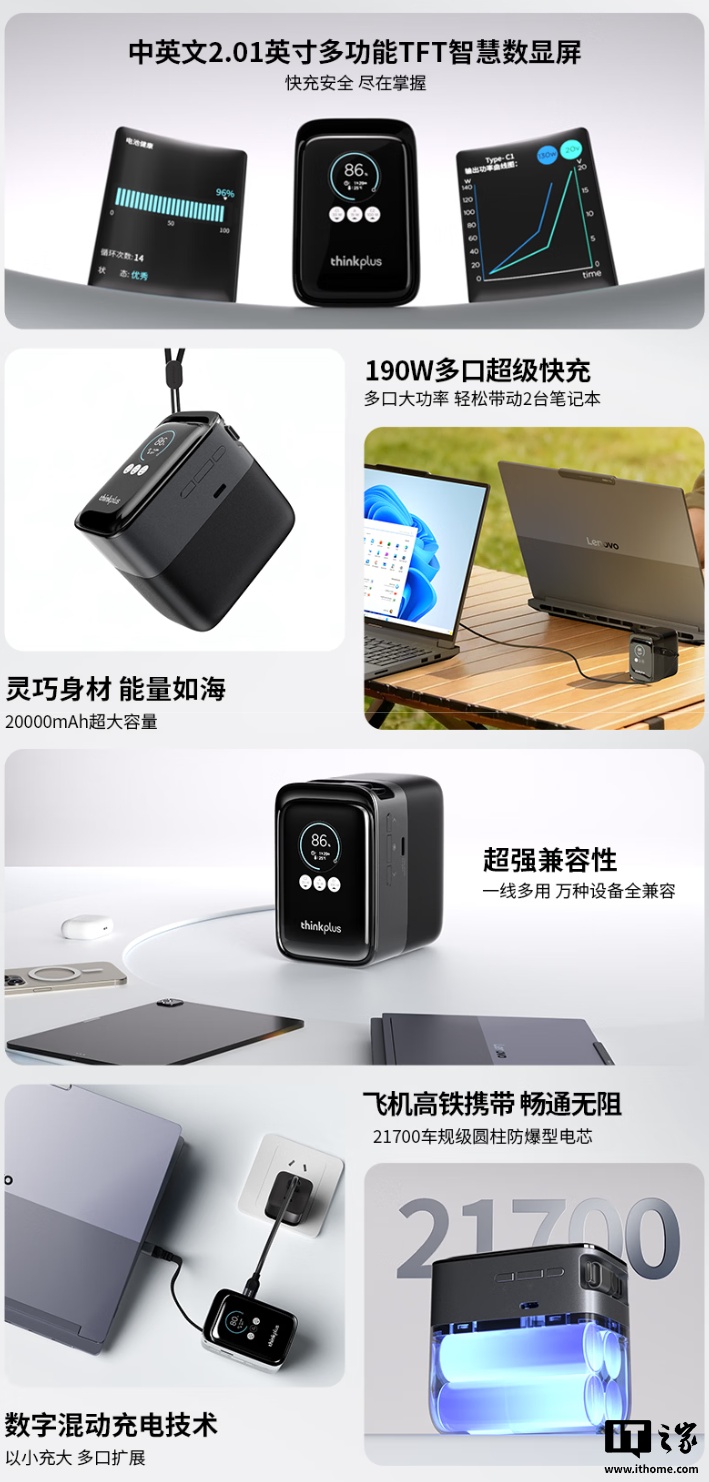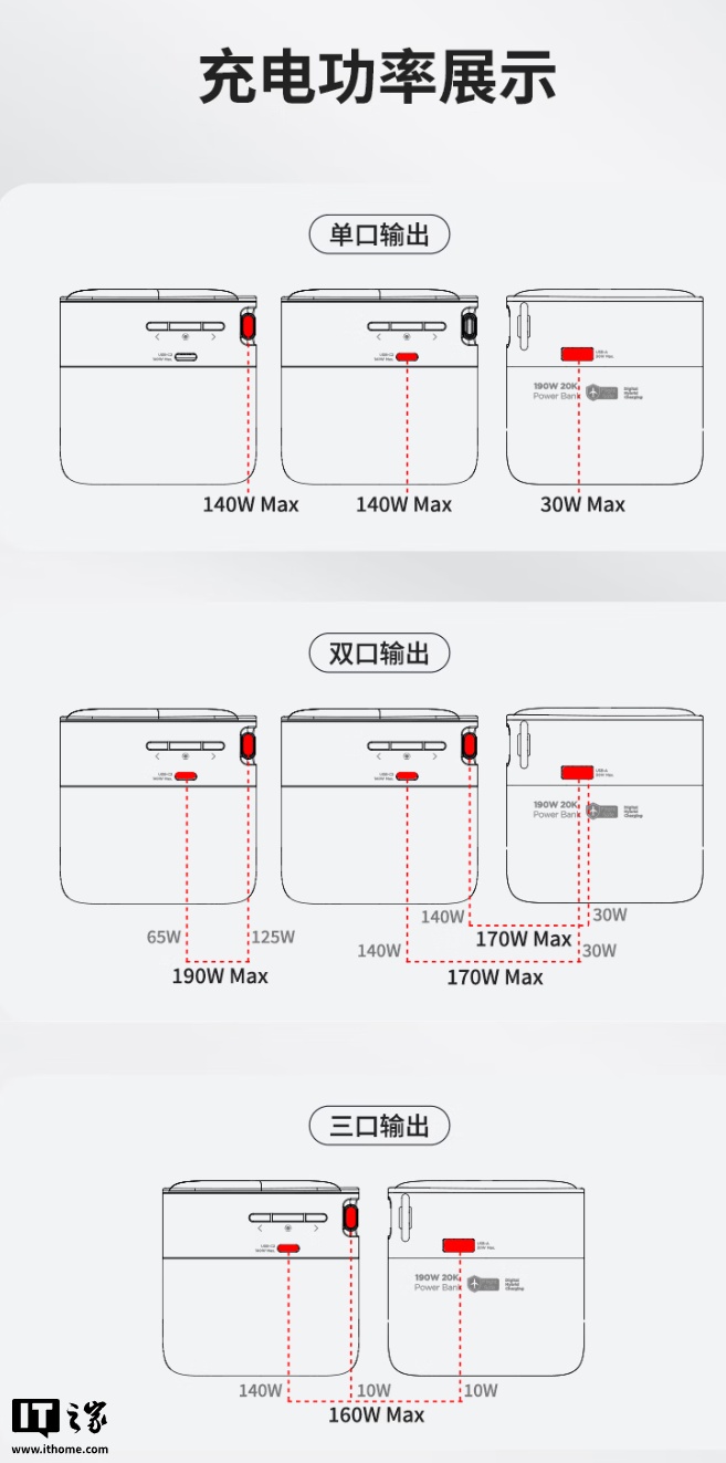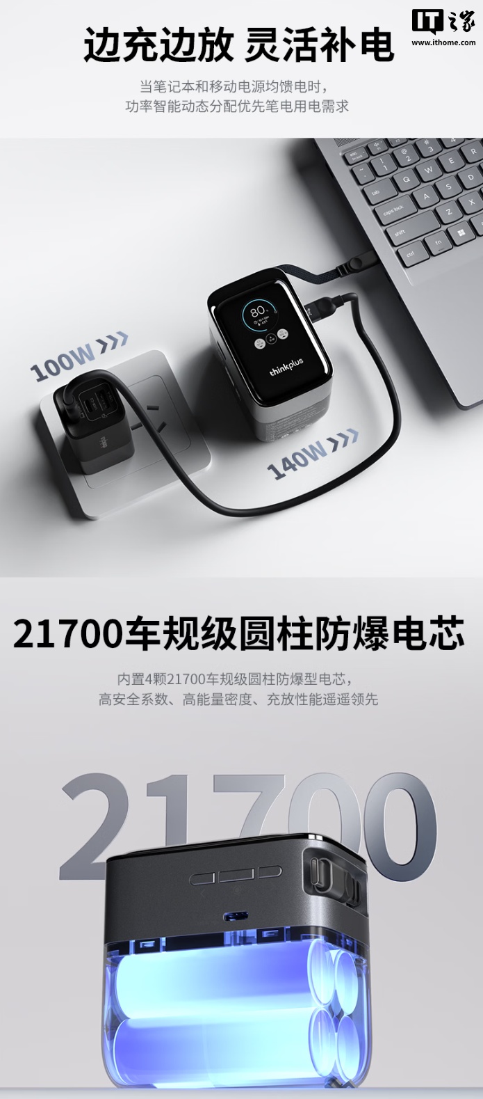 规格方面,这款充电宝的自充功率可达 100W Max,单口最高输出功率 140W Max,支持 ThinkBook、ThinkPad、MacBook、MateBook 等笔记本,多口输出功率最高可达 190W Max,满足手机、电脑等多设备同时补能。