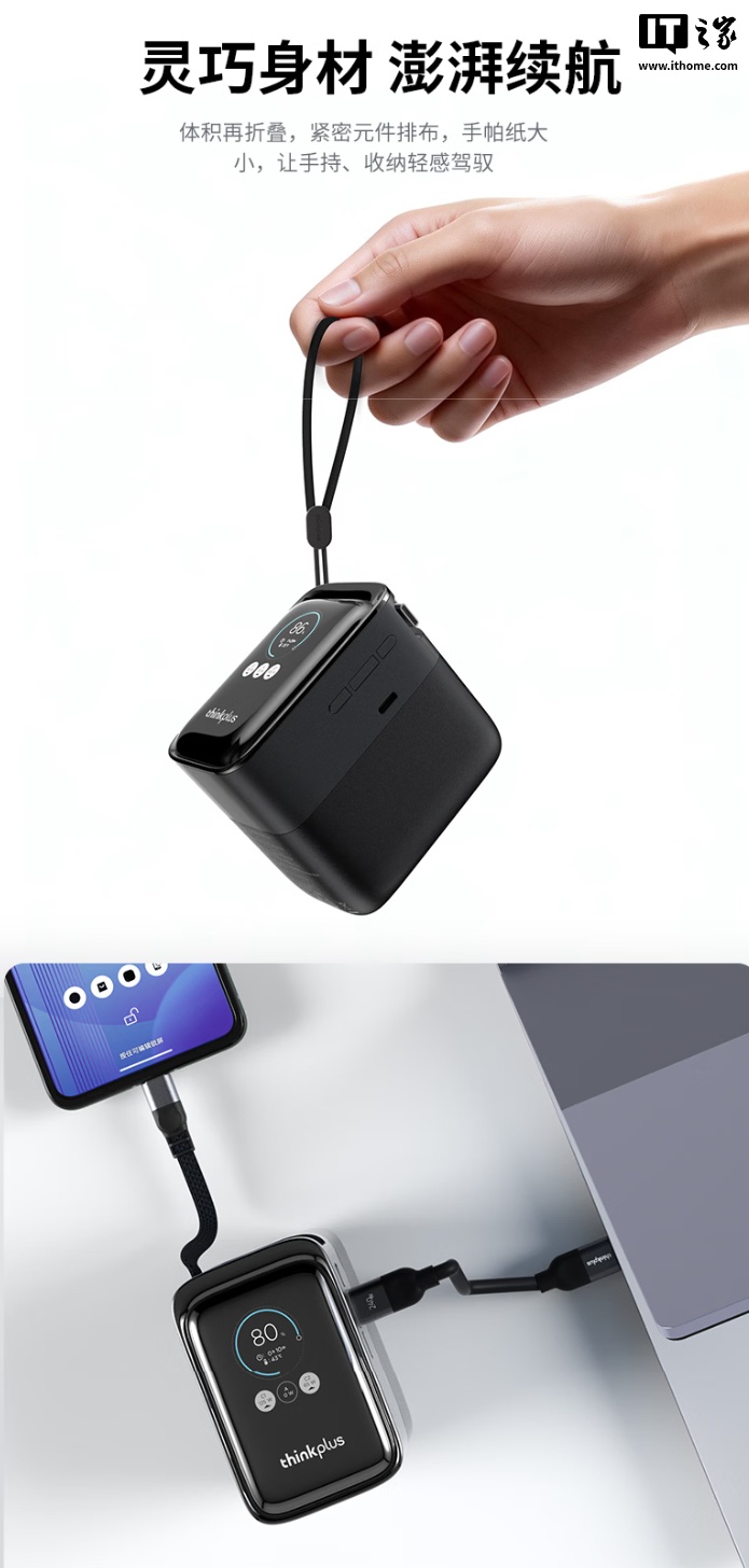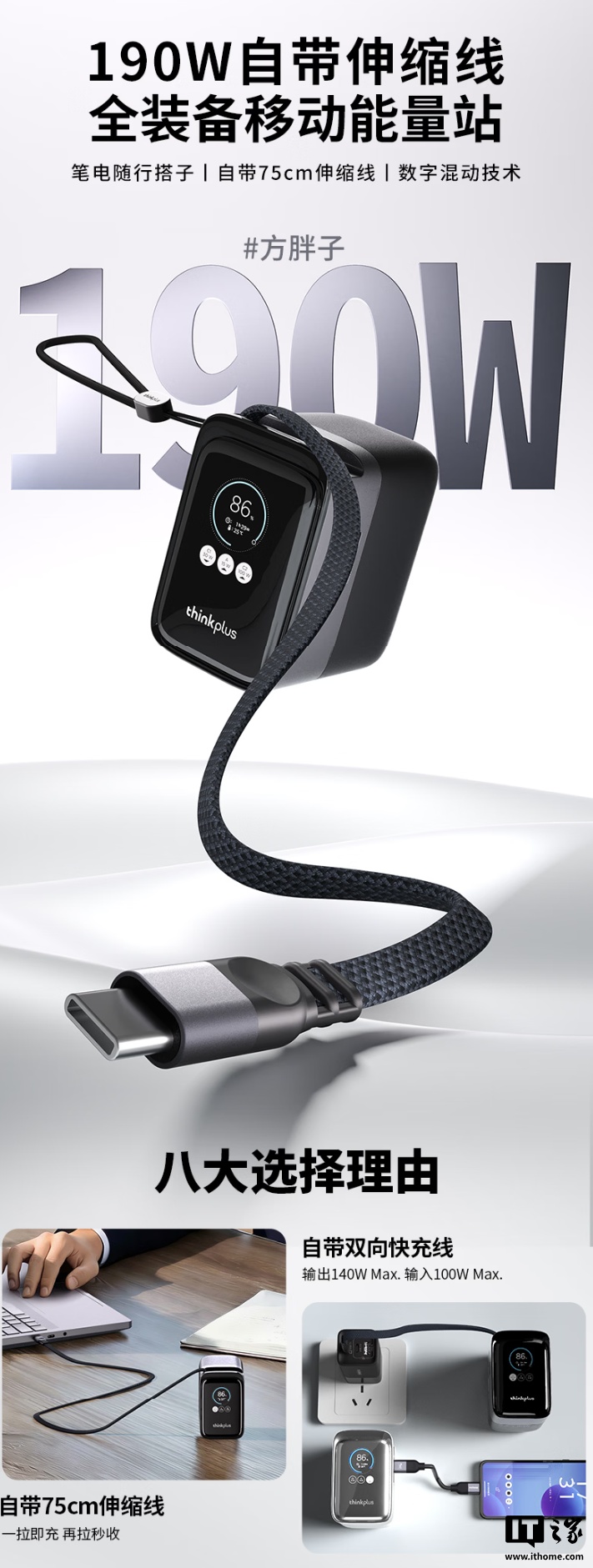 IT之家 4 月 18 日消息,联想 ThinkPlus 方胖子 190W 自带伸缩线移动电源现已开售,新品主打 190W 多口超级快充、自带 75cm 双向快充伸缩线,售价 349 元。