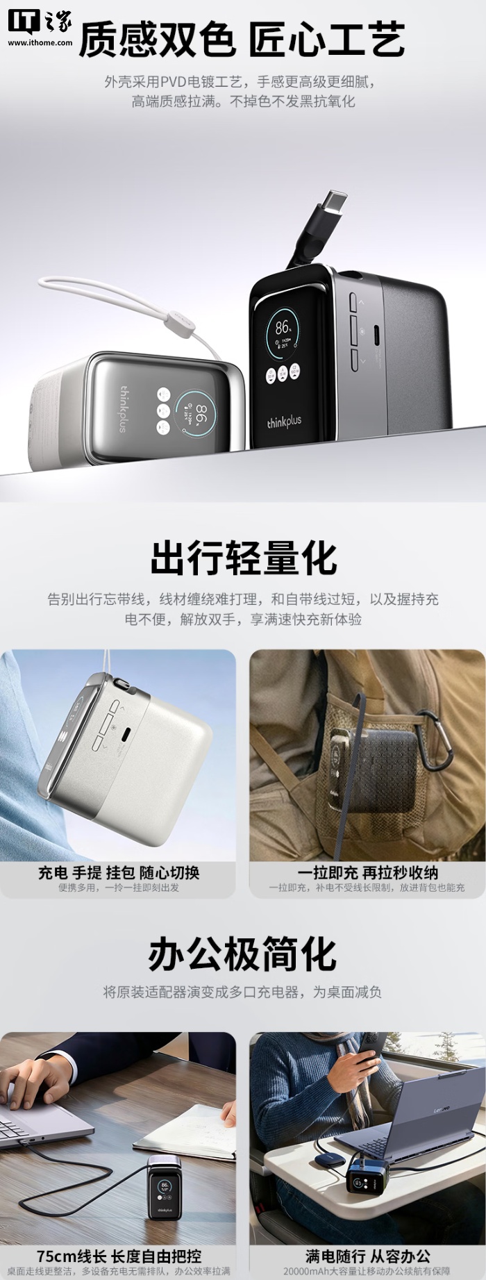 据介绍,这款充电宝外壳采用 PVD 电镀工艺,拥有黑色、白色两种配色可选,带有挂绳,伸缩线长度为 75cm,可自由把控长度。